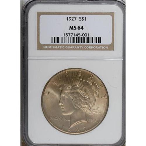 <B>1927 $1 MS64 NGC.</B></I> NGC Census: (716/74). PCGS Population (1232/218). Mintage: 848,000. Numismedia Wsl. Price for NGC/PCGS coin in MS64: $380. (#7370)<BR><BR><B>Coin Engraver:</B> Anthony de Francisci<BR><BR><b>Shipping:</b> Coins & Currency (<a target="_blank" href="http://www.heritageauctions.com/common/shipping.php">view shipping information</a>)