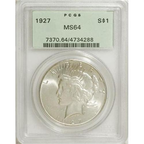 <B>1927 $1 MS64 PCGS.</B></I> PCGS Population (1205/213). NGC Census: (708/74). Mintage: 848,000. Numismedia Wsl. Price for NGC/PCGS coin in MS64: $380. (#7370)<BR><BR><B>Coin Engraver:</B> Anthony de Francisci<BR><BR><b>Shipping:</b> Coins & Currency (<a target="_blank" href="http://www.heritageauctions.com/common/shipping.php">view shipping information</a>)