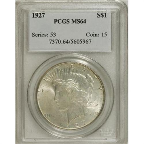 <B>1927 $1 MS64 PCGS.</B></I> PCGS Population (1228/218). NGC Census: (709/74). Mintage: 848,000. Numismedia Wsl. Price for NGC/PCGS coin in MS64: $380. (#7370)<BR><BR><B>Coin Engraver:</B> Anthony de Francisci<BR><BR><b>Shipping:</b> Coins & Currency (<a target="_blank" href="http://www.heritageauctions.com/common/shipping.php">view shipping information</a>)