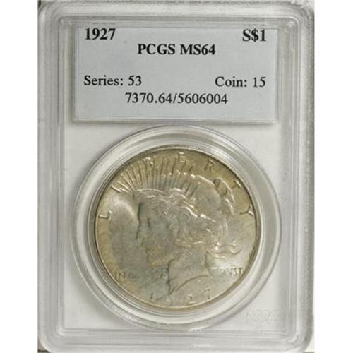 <B>1927 $1 MS64 PCGS.</B></I> PCGS Population (1262/221). NGC Census: (716/74). Mintage: 848,000. Numismedia Wsl. Price for NGC/PCGS coin in MS64: $380. (#7370)<BR><BR><B>Coin Engraver:</B> Anthony de Francisci<BR><BR><b>Shipping:</b> Coins & Currency (<a target="_blank" href="http://www.heritageauctions.com/common/shipping.php">view shipping information</a>)