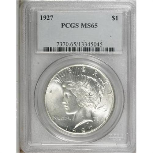 <B>1927 $1 MS65 PCGS.</B></I> A phenomenally pristine specimen for the grade, with radiant cartwheel luster more typically found on a Morgan dollar and fields that are more brilliant than frosty or satiny. This silver-white piece reveals few abrasions, even under a loupe. PCGS has certified only five pieces finer, and it is difficult to envision a nicer piece (12/07).<BR><BR><B>Coin Engraver:</B> Anthony de Francisci<BR><BR><b>Shipping:</b> Coins & Currency (<a target="_blank" href="http://www.heritageauctions.com/common/shipping.php">view shipping information</a>)