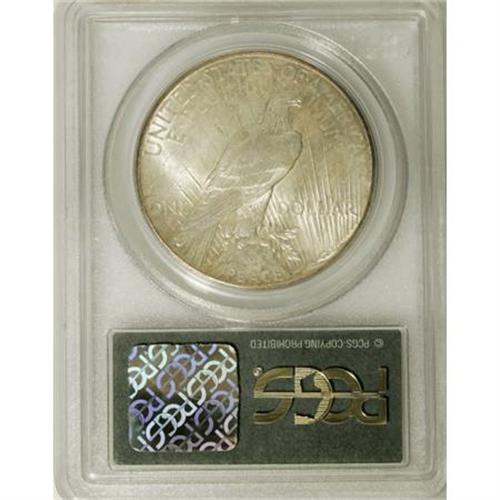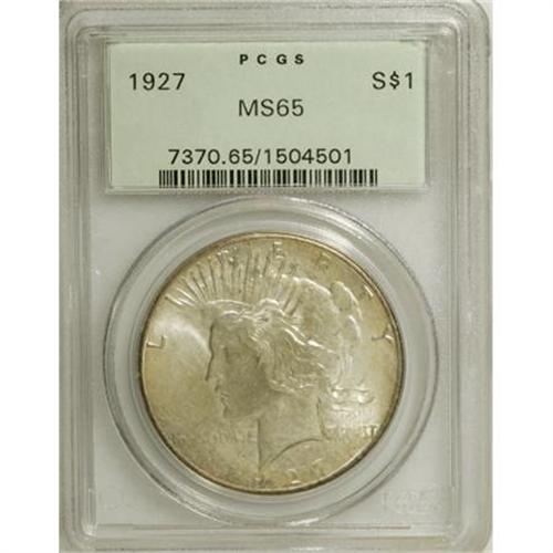 <B>1927 $1 MS65 PCGS.</B></I> Splashes of pastel grayish-green patination run over the highly lustrous surfaces of this Gem Peace dollar, and a well directed strike brings out strong definition on the design elements. A few grade-consistent marks do not detract. From a mintage of 848,000 pieces. Housed in a green-label holder.<BR><BR><B>Coin Engraver:</B> Anthony de Francisci<BR><BR><b>Shipping:</b> Coins & Currency (<a target="_blank" href="http://www.heritageauctions.com/common/shipping.php">view shipping information</a>)