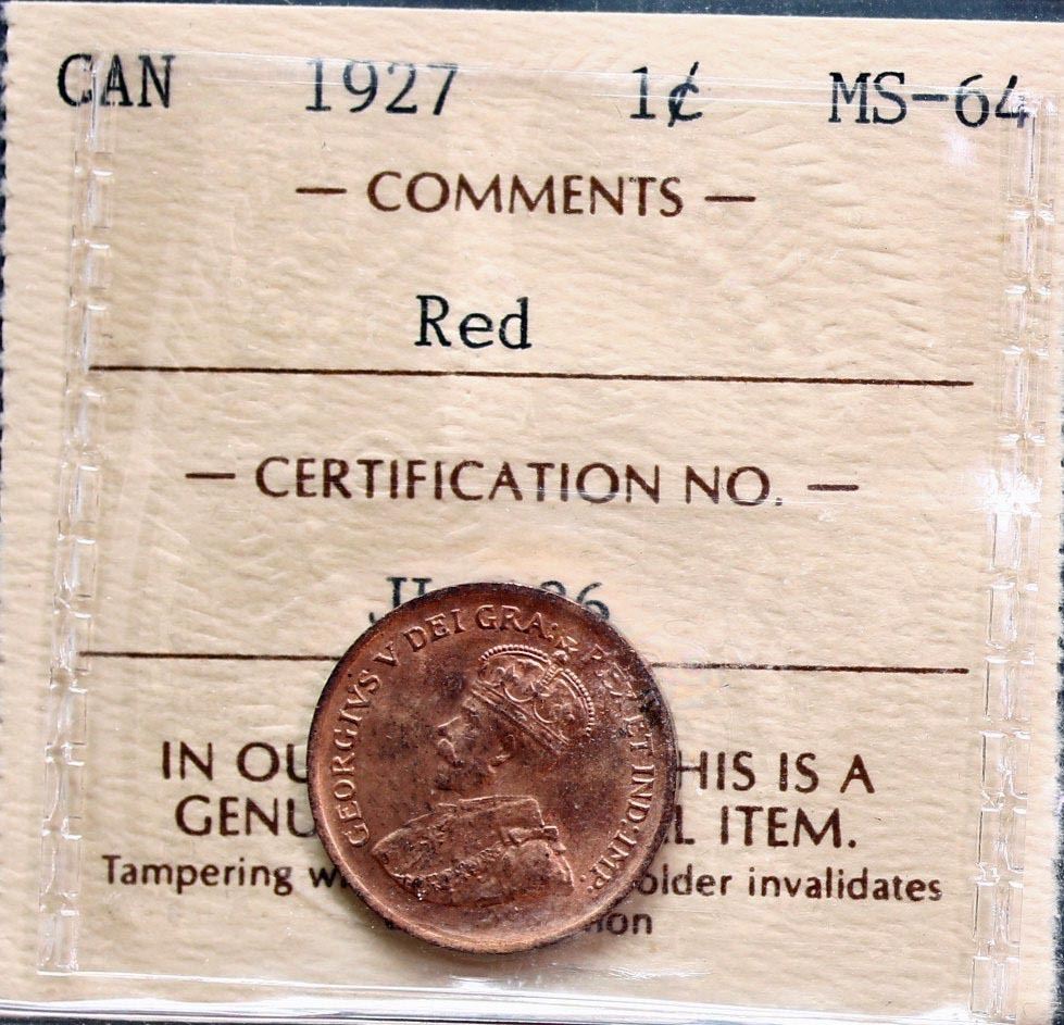 1927 1¢ PCGS Choice Mint State-64RED. A nice 90% Red and lustrous key example with smooth clean fields.