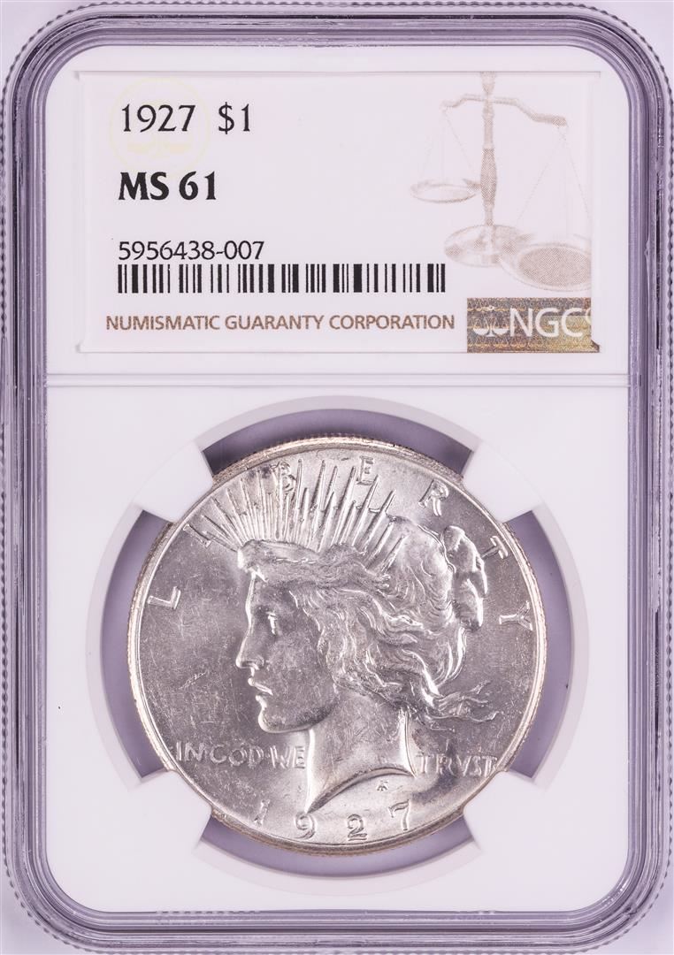 One 1927 $1 Peace Silver Dollar Coin NGC MS61. NGC Certified.