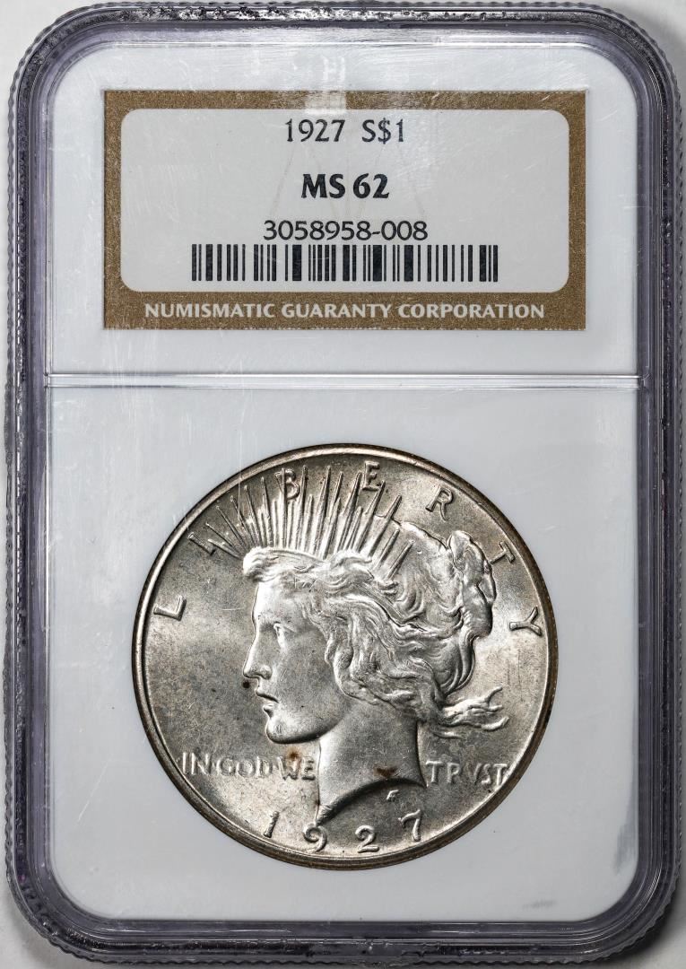 One 1927 $1 Peace Silver Dollar Coin NGC MS62. NGC Certified.