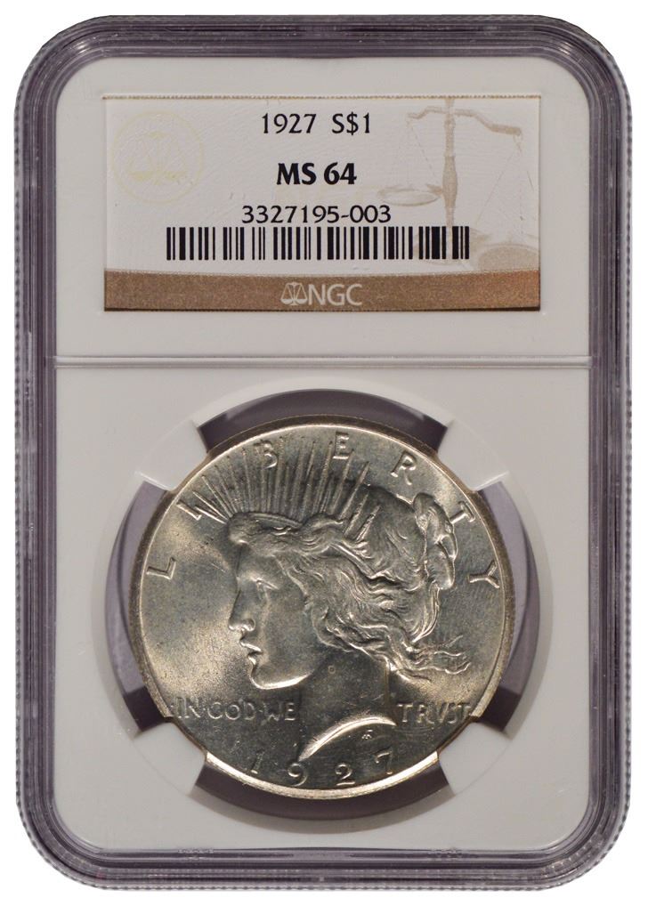 One 1927 $1 Peace Silver Dollar Coin NGC MS64.