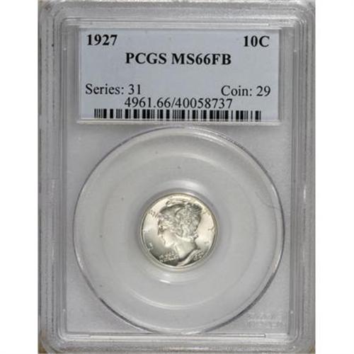 <B>1927 10C MS66 Full Bands PCGS.</B></I> PCGS Population (91/15). NGC Census: (21/5). Mintage: 28,080,000. Numismedia Wsl. Price for NGC/PCGS coin in MS66: $700. (#4961)<BR><BR><B>Coin Engraver:</B> Adolph A. Weinman<BR><BR><b>Shipping:</b> Coins & Currency (<a target="_blank" href="http://www.heritageauctions.com/common/shipping.php">view shipping information</a>\)