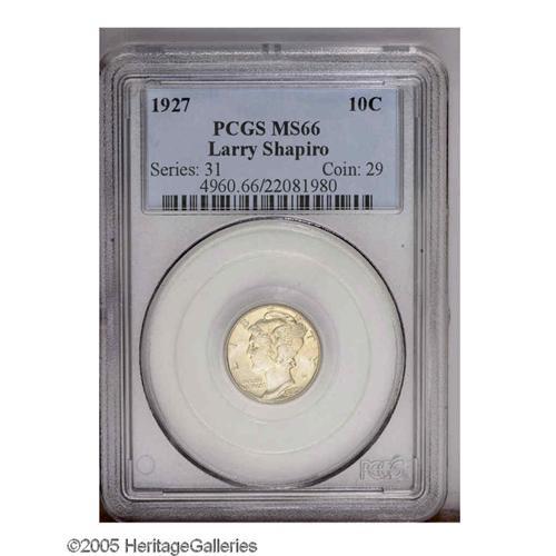<B>1927<10C> MS66 PCGS.</B></I> Brilliant with just the lightest of amber subdued surfaces. Attractive sharp strike.<BR><I>From The Larry Shapiro #1 All-Time Finest Mercury Dimes Basic PCGS Registry Set.</B></I>