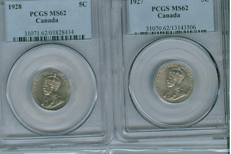 1927 & 1928 5¢ PCGS MS62. Lot of 2 coins.