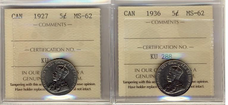 1927 & 1936 5¢ ICCS MS62. Lot of 2 coins.