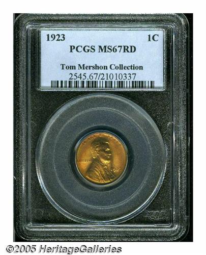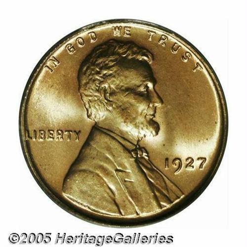 <B>1927<1C> MS67 Red PCGS.</B></I> Razor sharp surfaces are aglow with orange-gold color and sparkling mint luster. A few trivial flecks of carbon on the obverse are more an assurance of originality than any kind of disturbance. There are hundreds of Gem Red survivors of this early P-mint, but only a miniscule percentage ventures into the Superb category. Population: 22 in 67, 0 finer (3/05).<BR><I>From The Tom Mershon #2 All-Time PCGS Registry Set of Lincoln Wheat Cents.</B></I>