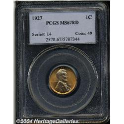 <B>1927<1C> MS67 Red PCGS.</B></I> Bright, fiery-red luster is complemented with abundant orange tinting circling all but the obverse device and all of the reverse side. Spot-free, only a couple of microscopic marks are seen in the reverse field. Population: 22 in 67, 0 finer (9/04). <BR><BR><B>Important notice:</B> Heritage usually auctions material at the rate of 200-250 lots per hour. On some occasions eBay Live bid software or the Internet may not be able to keep up with the pace of the auction. We recommend placing a realistic absentee bid now as insurance to avoid disappointment. Occasionally the auctioneer may eliminate or reject an eBay Live bid, and the auctioneer may also reopen a lot after the close of the eBay live bidding (usually because we missed an audience bid), and may reject your bid even if it shows you as the winning bidder. By bidding via eBay Live, you agree that Heritage may award the lot to another bidder at its sole discretion under the circumstances described above or any other reasonable circumstances. Since eBay bids are not shown to us until we open the lot on the floor, we treat those bids just like floor bids. In most cases the floor responds before the eBay bid is presented to us, due to Internet lag time, so for consistency we have made it a policy that floor bids are always considered first over tie eBay live bids. Also please note that all Heritage lots purchased through eBay Live carry a 20% Buyer's Premium. Please make sure you read the Terms and Conditions before you bid.