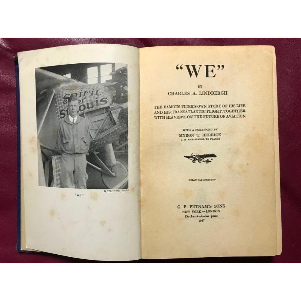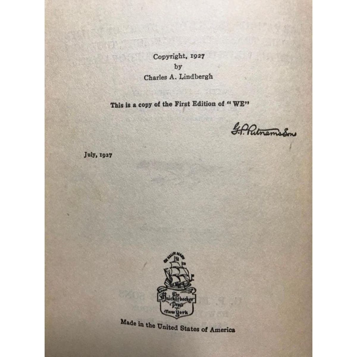 A 1927 first edition copy of "WE" by Charles A. Lindbergh. The famous flier's own story of his life and his transatlantic flight, together with his views on the future of aviation, with a forward by Myron T. Herrick ( U.S. Ambassador to France ). G. P. Putnam's Sons New York - London, The Knickerbocker Press. All photographs inside in tact. 318 pages.Â