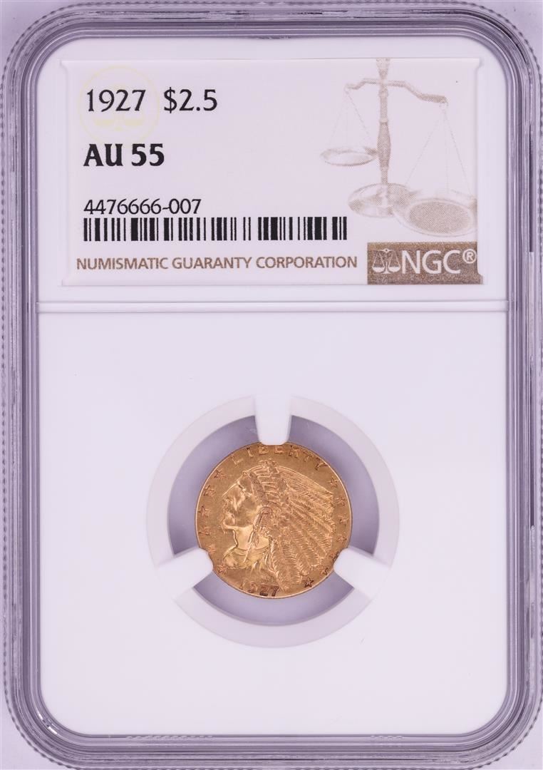 One 1927 $2 1/2 Indian Head Quarter Eagle Gold Coin NGC AU55. NGC Certified.