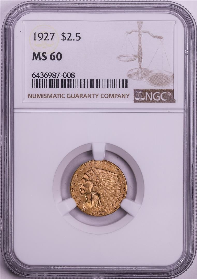 One 1927 $2 1/2 Indian Head Quarter Eagle Gold Coin NGC MS60. NGC Certified.
