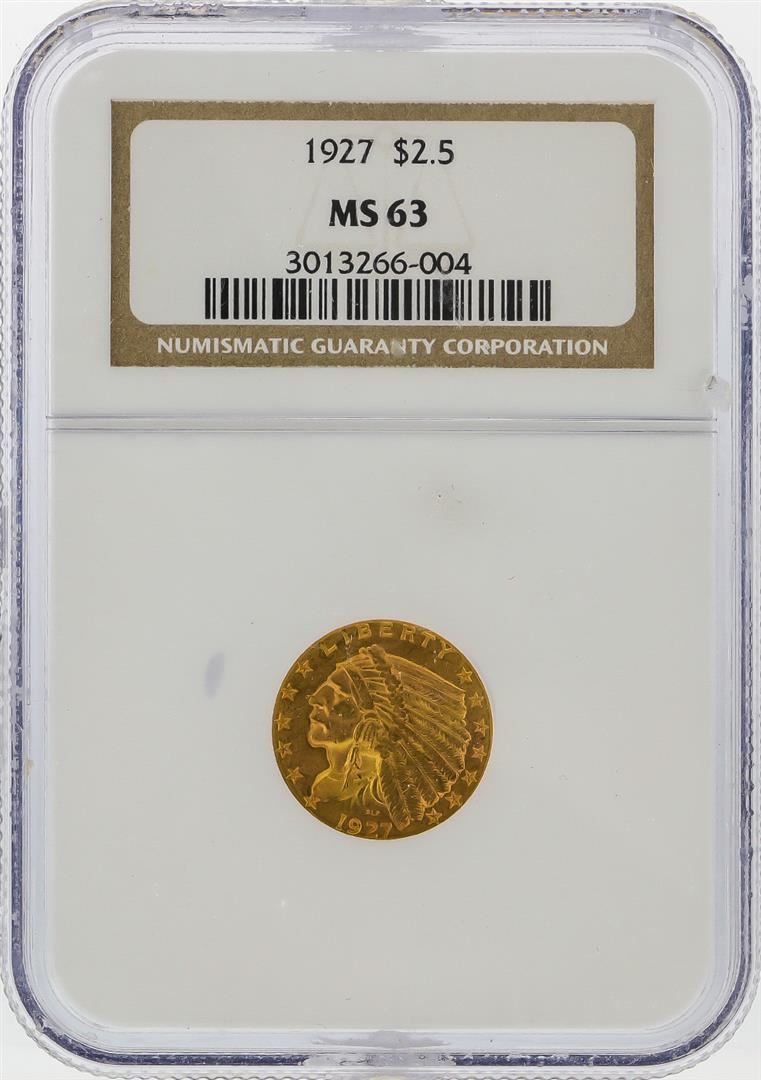One 1927 $2 1/2 Indian Head Quarter Eagle Gold Coin NGC MS63. NGC Certified.