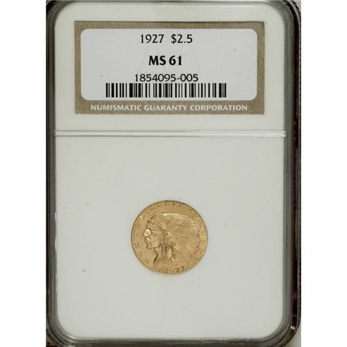 <B>1927 $2 1/2 MS61 NGC.</B></I> NGC Census: (1246/7982). PCGS Population (750/5790). Mintage: 388,000. Numismedia Wsl. Price: $332. (#7951)<BR><BR><b>Shipping:</b> Coins & Currency (<a target="_blank" href="http://www.heritageauctions.com/common/shipping.php">view shipping information</a>)
