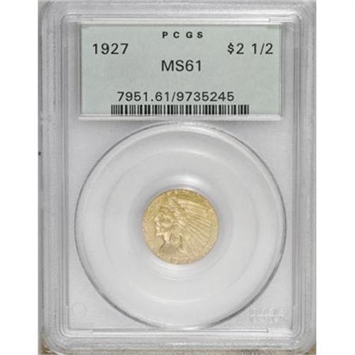 <B>1927 $2 1/2 MS61 PCGS.</B></I> PCGS Population (771/6155). NGC Census: (1331/8481). Mintage: 388,000. Numismedia Wsl. Price for NGC/PCGS coin in MS61: $325. (#7951)<BR><BR><B>Coin Engraver:</B> Bela Lyon Pratt<BR><BR><b>Shipping:</b> Coins & Currency (<a target="_blank" href="http://www.heritageauctions.com/common/shipping.php">view shipping information</a>)