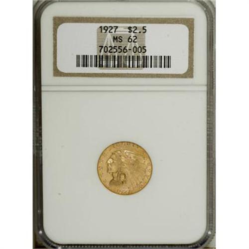 <B>1927 $2 1/2 MS62 NGC.</B></I> NGC Census: (3403/4816). PCGS Population (2011/3931). Mintage: 388,000. Numismedia Wsl. Price for NGC/PCGS coin in MS62: $455. (#7951)<BR><BR><B>Coin Engraver:</B> Bela Lyon Pratt<BR><BR><b>Shipping:</b> Coins & Currency (<a target="_blank" href="http://www.heritageauctions.com/common/shipping.php">view shipping information</a>)