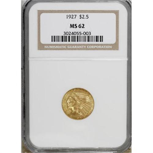<B>1927 $2 1/2 MS62 NGC.</B></I> . NGC Census: (3567/5083). PCGS Population (2068/4176). Mintage: 388,000. Numismedia Wsl. Price for NGC/PCGS coin in MS62: $435. (#7951)<BR><BR><B>Coin Engraver:</B> Bela Lyon Pratt<BR><BR><b>Shipping:</b> Coins & Currency (<a target="_blank" href="http://www.heritageauctions.com/common/shipping.php">view shipping information</a>)