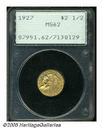 <B>1927<$2 1/2> MS62 PCGS.</B></I> Luminous straw-gold color and a good strike proclaim the charms of this unmarked and pleasing type coin. Certified in a first generation holder.