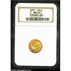 1927 $2 1/2 MS63 NGC. A sharply struck coin that has rich olive-gold color. Luster rolls easily across the frosty devices. Important notice: We expect to be auctioning lots at the rate of 200-250 per hour. Sometimes eBay Premier live bid software cannot keep up with that pace, so we strongly recommend that you place a realistic proxy bid now as insurance to avoid disappointment. Also please note that all Heritage/CAA lots purchased through eBay Premier carry a 20% Buyer's Premium. Please make sure you read the Terms and Conditions.
