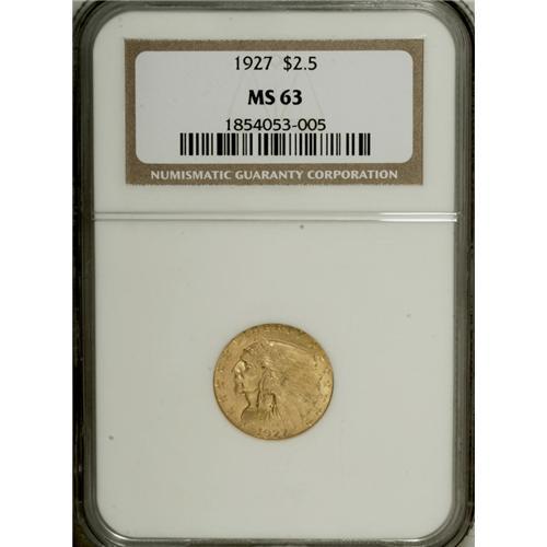<B>1927 $2 1/2 MS63 NGC.</B></I> This Select yellow-orange representative has soft, pleasing luster and a handful of abrasions on its well struck devices. An interesting example from the later issues, which began after this denomination's decade-long hiatus.<BR><BR><b>Shipping:</b> Coins & Currency (<a target="_blank" href="http://www.heritageauctions.com/common/shipping.php">view shipping information</a>)