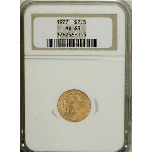 <B>1927 $2 1/2 MS63 NGC.</B></I> NGC Census: (2811/2114). PCGS Population (2165/1900). Mintage: 388,000. Numismedia Wsl. Price for NGC/PCGS coin in MS63: $825. (#7951)<BR><BR><B>Coin Engraver:</B> Bela Lyon Pratt<BR><BR><b>Shipping:</b> Coins & Currency (<a target="_blank" href="http://www.heritageauctions.com/common/shipping.php">view shipping information</a>)