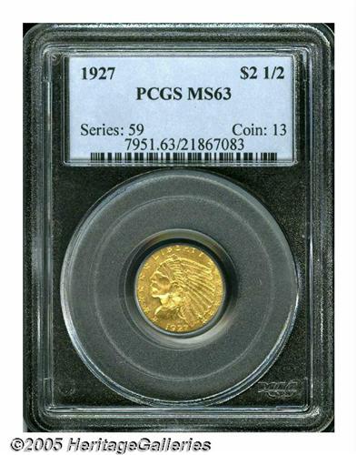 <B>1927<$2 1/2> MS63 PCGS.</B></I> Bright peach-gold surfaces display nicely struck design elements. A couple of small alloy spots are noted on the left wing of the eagle, and a few minor handling marks appear in the raised fields of each side.