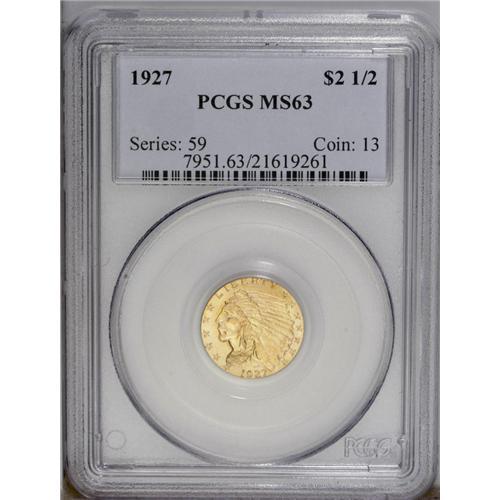 <B>1927<$2 1/2> MS63 PCGS.</B></I> Mostly honey-gold, with apricot tints. The marks encountered are typical for the Select designation, with several light wispy abrasions in the fields. <BR><BR><B>Important notice:</B> Heritage usually auctions material at the rate of 200-250 lots per hour. On some occasions eBay Live bid software or the Internet may not be able to keep up with the pace of the auction. We recommend placing a realistic absentee bid now as insurance to avoid disappointment. Occasionally the auctioneer may eliminate or reject an eBay Live bid, and the auctioneer may also reopen a lot after the close of the eBay live bidding (usually because we missed an audience bid), and may reject your bid even if it shows you as the winning bidder. By bidding via eBay Live, you agree that Heritage may award the lot to another bidder at its sole discretion under the circumstances described above or any other reasonable circumstances. Since eBay bids are not shown to us until we open the lot on the floor, we treat those bids just like floor bids. In most cases the floor responds before the eBay bid is presented to us, due to Internet lag time, so for consistency we have made it a policy that floor bids are always considered first over tie eBay live bids. Also please note that all Heritage lots purchased through eBay Live carry a 20% Buyer's Premium. Please make sure you read the Terms and Conditions before you bid. This lot is being auctioned in conjunction with a live floor auction by Heritage Galleries & Auctioneers. All final auction and invoice information will be supplied by Heritage Galleries & Auctioneers, and all other information should be considered preliminary. Lot:2527 <BR><BR><B>Winning Notification and Billing:</B> After the FINAL session in this auction is complete, Heritage will send e-mail and snail mail invoices. This process normally takes several days. All final auction and invoice information will be supplied by Heritage Galleries & Auctioneers, and all other information should be considered preliminary. <BR><BR>This auction will be conducted on a live auction floor and over the Internet through eBay Live. If you choose to place an absentee bid, please take a moment to <font color='#0000ff'><u><a href='http://pages.ebay.com/liveauctions/help/before/laabsentee.html'>learn how eBay Live absentee bidding works</a></u></font><font color='#000000'>
