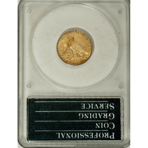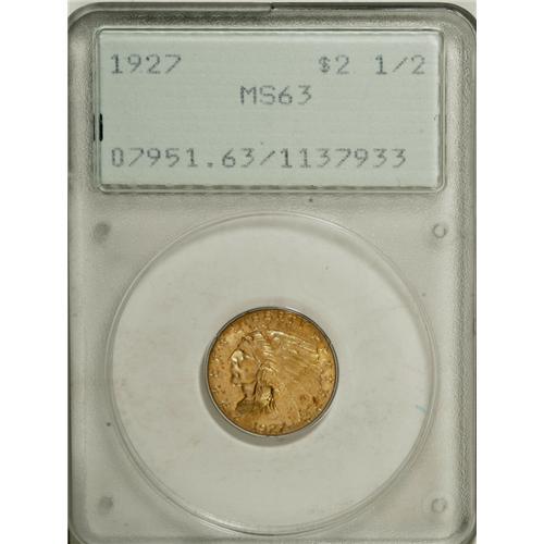 <B>1927 $2 1/2 MS63 PCGS.</B></I> This shimmering orange-gold example has a pleasing strike and a well preserved obverse. A thin mark on the right reverse field is all that limits the grade. Encapsulated in a first generation holder.<BR><BR><b>Shipping:</b> Coins & Currency (<a target="_blank" href="http://www.heritageauctions.com/common/shipping.php">view shipping information</a>)