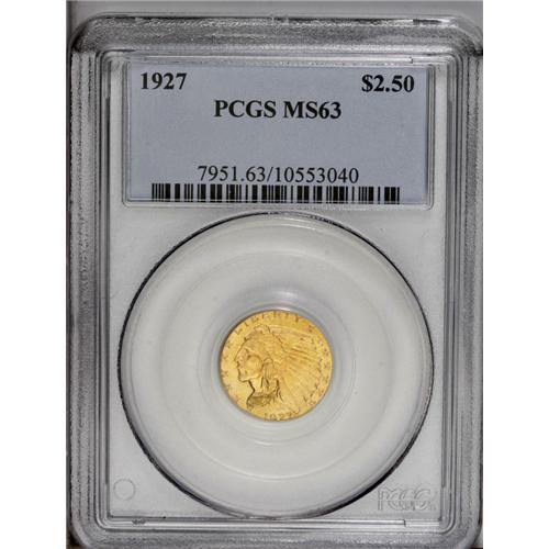 <B>1927<$2 1/2> MS63 PCGS.</B></I> This specimen possesses a wonderful deep golden color. At first glimpse, there is an impression of a significantly higher grade, yet close inspection reveals a fine pinscratch along the lock of hair on the Indian's neck. Attractive and pleasing, nonetheless.