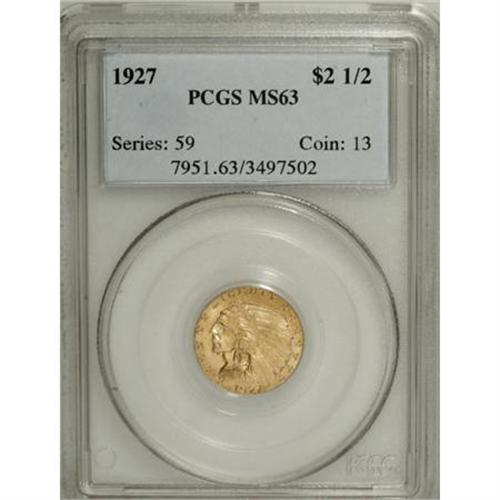 <B>1927 $2 1/2 MS63 PCGS.</B></I> PCGS Population (2125/1760). NGC Census: (2754/2051). Mintage: 388,000. Numismedia Wsl. Price for NGC/PCGS coin in MS63: $740. (#7951)<BR><BR><B>Coin Engraver:</B> Bela Lyon Pratt<BR><BR><b>Shipping:</b> Coins & Currency (<a target="_blank" href="http://www.heritageauctions.com/common/shipping.php">view shipping information</a>\)