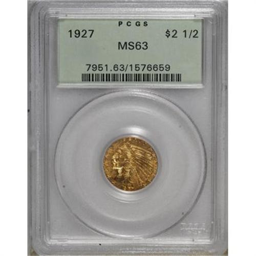 <B>1927 $2 1/2 MS63 PCGS.</B></I> PCGS Population (2241/2032). NGC Census: (2874/2251). Mintage: 388,000. Numismedia Wsl. Price for NGC/PCGS coin in MS63: $860. (#7951)<BR><BR><B>Coin Engraver:</B> Bela Lyon Pratt<BR><BR><b>Shipping:</b> Coins & Currency (<a target="_blank" href="http://www.heritageauctions.com/common/shipping.php">view shipping information</a>)