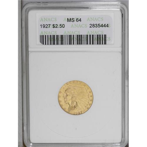 <B>1927<$2 1/2> MS64 ANACS.</B></I> Typically attractive for the assigned grade, both sides are lustrous with rich yellow-gold coloration and just a couple of tiny alloy spots. The sharp strike is free of criticism.