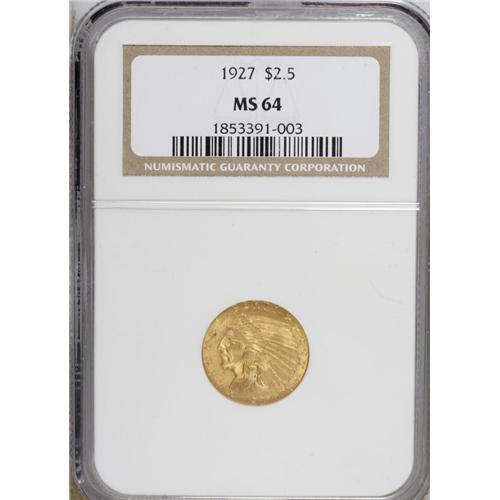<B>1927 $2 1/2 MS64 NGC.</B></I> Boldly struck with satin luster and lovely lime-green and peach toning. A slight grease streak (as made) is noted near obverse stars 5 and 6, and a few wispy marks are observed on each side of this lovely late-date near-Gem.<BR><BR><b>Shipping:</b> Coins & Currency (<a target="_blank" href="http://www.heritageauctions.com/common/shipping.php">view shipping information</a>)