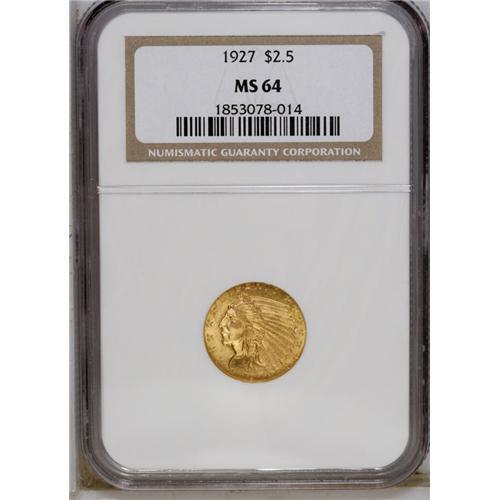 <B>1927 $2 1/2 MS64 NGC.</B></I> Choice and lustrous with a hint of apricot and green on the otherwise yellow-gold surfaces. The obverse has few marks overall, though the peripheral devices lack some definition.<BR><BR><b>Shipping:</b> Coin/Currency (<a target="_blank" href="http://www.heritageauctions.com/common/shipping.php">view shipping information</a>)