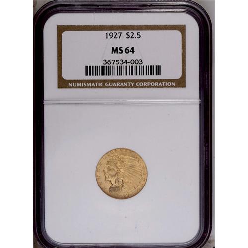 <B>1927<$2 1/2> MS64 NGC.</B></I> Deep peach-gold and rose toning inhabits the warm surfaces. Boldly struck with typical satiny luster and a few tiny marks on each side that are barely evident without a magnifier.