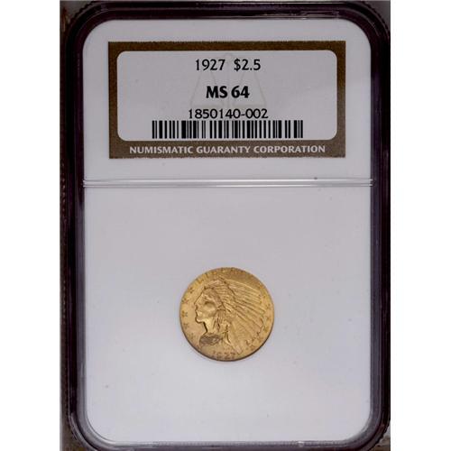 <B>1927<$2 1/2> MS64 NGC.</B></I> The bright peach-gold surfaces reveal boldly struck design elements and impressively careful preservation. A few wispy marks are noted on each side of the coin.