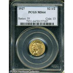 1927 $2 1/2 MS64 PCGS. A crisply struck and lustro <B>1927 $2 1/2 MS64 PCGS.</B></I> A crisply struck and lustrous straw-gold representative that is attractive despite a few wispy blemishes. <BR><BR><B>Important notice:</B> Heritage usually auctions material at the rate of 200-250 lots per hour. On some occasions eBay Live bid software or the Internet may not be able to keep up with the pace of the auction. We recommend placing a realistic absentee bid now as insurance to avoid disappointment. Occasionally the auctioneer may eliminate or reject an eBay Live bid, and the auctioneer may also reopen a lot after the close of the eBay live bidding (usually because we missed an audience bid), and may reject your bid even if it shows you as the winning bidder. By bidding via eBay Live, you agree that Heritage may award the lot to another bidder at its sole discretion under the circumstances described above or any other reasonable circumstances. Since eBay bids are not shown to us until we open the lot on the floor, we treat those bids just like floor bids. In most cases the floor responds before the eBay bid is presented to us, due to Internet lag time, so for consistency we have made it a policy that floor bids are always considered first over tie eBay live bids. Also please note that all Heritage lots purchased through eBay Live carry a 20% Buyer's Premium. Please make sure you read the Terms and Conditions before you bid. This lot is being auctioned in conjunction with a live floor auction by Heritage Galleries & Auctioneers. All final auction and invoice information will be supplied by Heritage Galleries & Auctioneers, and all other information should be considered preliminary. Lot:6580