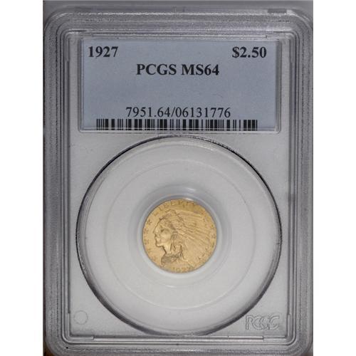 <B>1927 $2 1/2 MS64 PCGS.</B></I> A few tiny blemishes on each side keep this from Gem quality. It is an attractive example with frosty orange-gold luster.
