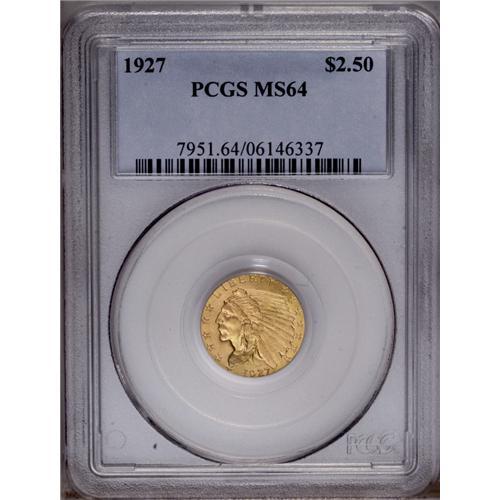 <B>1927<$2 1/2> MS64 PCGS.</B></I> A pleasing Choice example with satin luster and peach-gold surfaces that display lime-green accents on the highpoints. A couple of minor field marks are noticeable on the reverse, along with an interesting die break (as struck) that encircles DOLLA and crosses through 2 1/2.