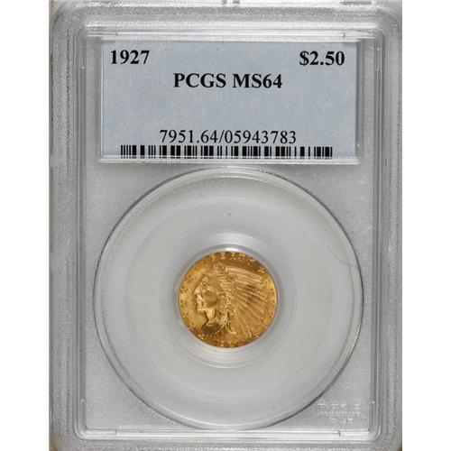 <B>1927 $2 1/2 MS64 PCGS.</B></I> A precisely struck and satiny golden-tan representative that retains glimpses of apple-green within the recesses of the portrait. Slight merging of detail is noted within the headdress, as nearly always for the type.<BR><BR><b>Shipping:</b> Coins & Currency (<a target="_blank" href="http://www.heritageauctions.com/common/shipping.php">view shipping information</a>)