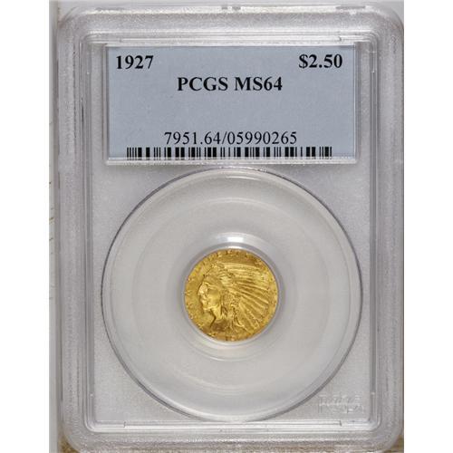 <B>1927 $2 1/2 MS64 PCGS.</B></I> Highly lustrous peach-gold surfaces exhibit well struck design elements. A few light marks occur in the upper reverse fields that limit the grade.<BR><BR><b>Shipping:</b> Coin/Currency (<a target="_blank" href="http://www.heritageauctions.com/common/shipping.php">view shipping information</a>)