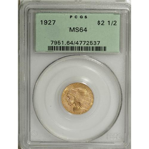 <B>1927 $2 1/2 MS64 PCGS.</B></I> Sharply struck and highly lustrous, with rich brassy-gold and steel-green toning and two or three bright red-orange alloy spots on each side. A few slight surface blemishes limit the grade. Housed in an earlier PCGS holder with a green label.<BR><BR><b>Shipping:</b> Coin/Currency (<a target="_blank" href="http://www.heritageauctions.com/common/shipping.php">view shipping information</a>)