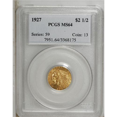 <B>1927<$2 1/2> MS64 PCGS.</B></I> The yellow-orange surfaces of this near-Gem have strong luster and appealing salmon highlights. Sharply struck and pleasing overall.