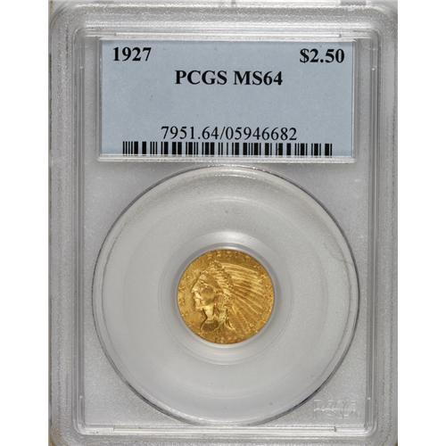 <B>1927 $2 1/2 MS64 PCGS.</B></I> Though its mintage is slightly lower than that of its fellows, this issue commands no premium that would dissuade type collectors. This satiny and well-defined piece has yellow-gold color on the obverse and mustard-gold on the reverse.<BR><BR><b>Shipping:</b> Coins & Currency (<a target="_blank" href="http://www.heritageauctions.com/common/shipping.php">view shipping information</a>)
