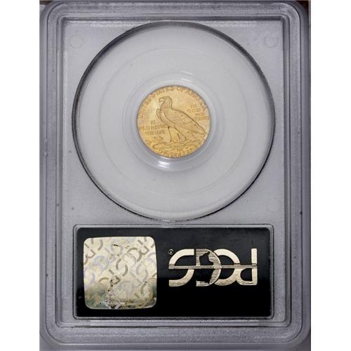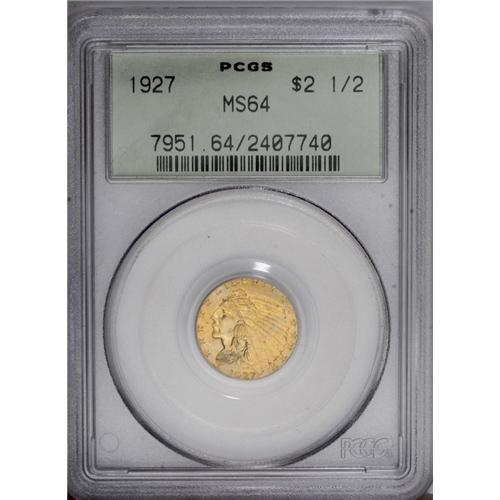 <B>1927<$2 1/2> MS64 PCGS.</B></I> Variegated peach-gold and lime-green patination bathes lustrous surfaces, and the design features are generally well executed. Grade-limiting marks are visible in the left (facing) obverse field, and in the upper reverse field, where an inoffensive pinscratch runs beneath the letters of TES OF AMERICA. Overall, a pleasing near-Gem.