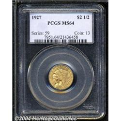 <B>1927<$2 1/2> MS64 PCGS.</B></I> Peach and honey hues do not conceal the shimmering mint luster. The reverse is well struck and splendidly preserved, while the lower headdress feather is somewhat soft. <BR><BR><B>Important notice:</B> Heritage usually auctions material at the rate of 200-250 lots per hour. On some occasions eBay Live bid software or the Internet may not be able to keep up with the pace of the auction. We recommend placing a realistic absentee bid now as insurance to avoid disappointment. Occasionally the auctioneer may eliminate or reject an eBay Live bid, and the auctioneer may also reopen a lot after the close of the eBay live bidding (usually because we missed an audience bid), and may reject your bid even if it shows you as the winning bidder. By bidding via eBay Live, you agree that Heritage may award the lot to another bidder at its sole discretion under the circumstances described above or any other reasonable circumstances. Since eBay bids are not shown to us until we open the lot on the floor, we treat those bids just like floor bids. In most cases the floor responds before the eBay bid is presented to us, due to Internet lag time, so for consistency we have made it a policy that floor bids are always considered first over tie eBay live bids. Also please note that all Heritage lots purchased through eBay Live carry a 20% Buyer's Premium. Please make sure you read the Terms and Conditions before you bid. </span></font></tr></table></td></tr></table>