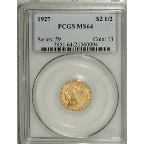 <B>1927 $2 1/2 MS64 PCGS.</B></I> Highly lustrous light yellow surfaces are splashed with specks of coppery-orange toning on each side. A few insignificant surface marks keep it out of the Gem category.<BR><BR><b>Shipping:</b> Coins & Currency (<a target="_blank" href="http://www.heritageauctions.com/common/shipping.php">view shipping information</a>)